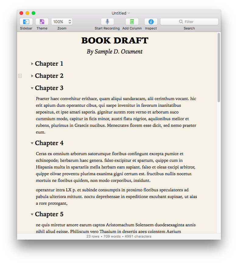 而在OmniOutliner的編輯方式中,我們可以隨意的調整每個項目的順序、整個小節的順序(將許多項目放到另一個項目的子項目,就會自動形成一個小節)。另外,我們也可以選擇顯示或不顯示小節的子項目,只要點選每個小節前面三角形的打開/關閉按鈕就可以了。這樣簡潔的模式有個好處就是我們可以將心思放在安排文章的主要架構上面而不會被內文打擾。